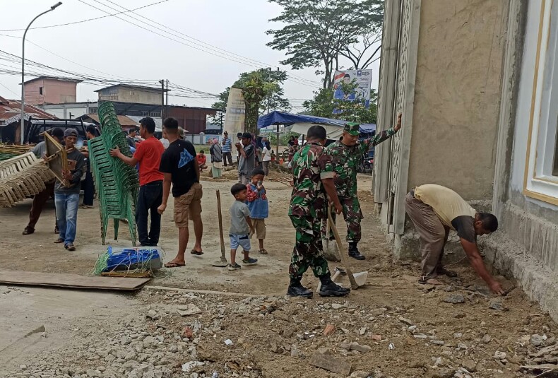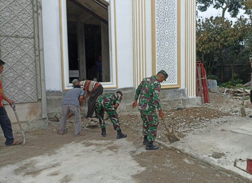 Kegiatan gotong royong dengan melakukan bersih bersih area halaman Mesjid, mulai dari membersihkan sampah sampah yang berserakan disekitaran masjid, perbersihan tempat wudhuk dan kamar mandi dilakukan Babinsa dan warga masyarakat dengan penuh semangat.
