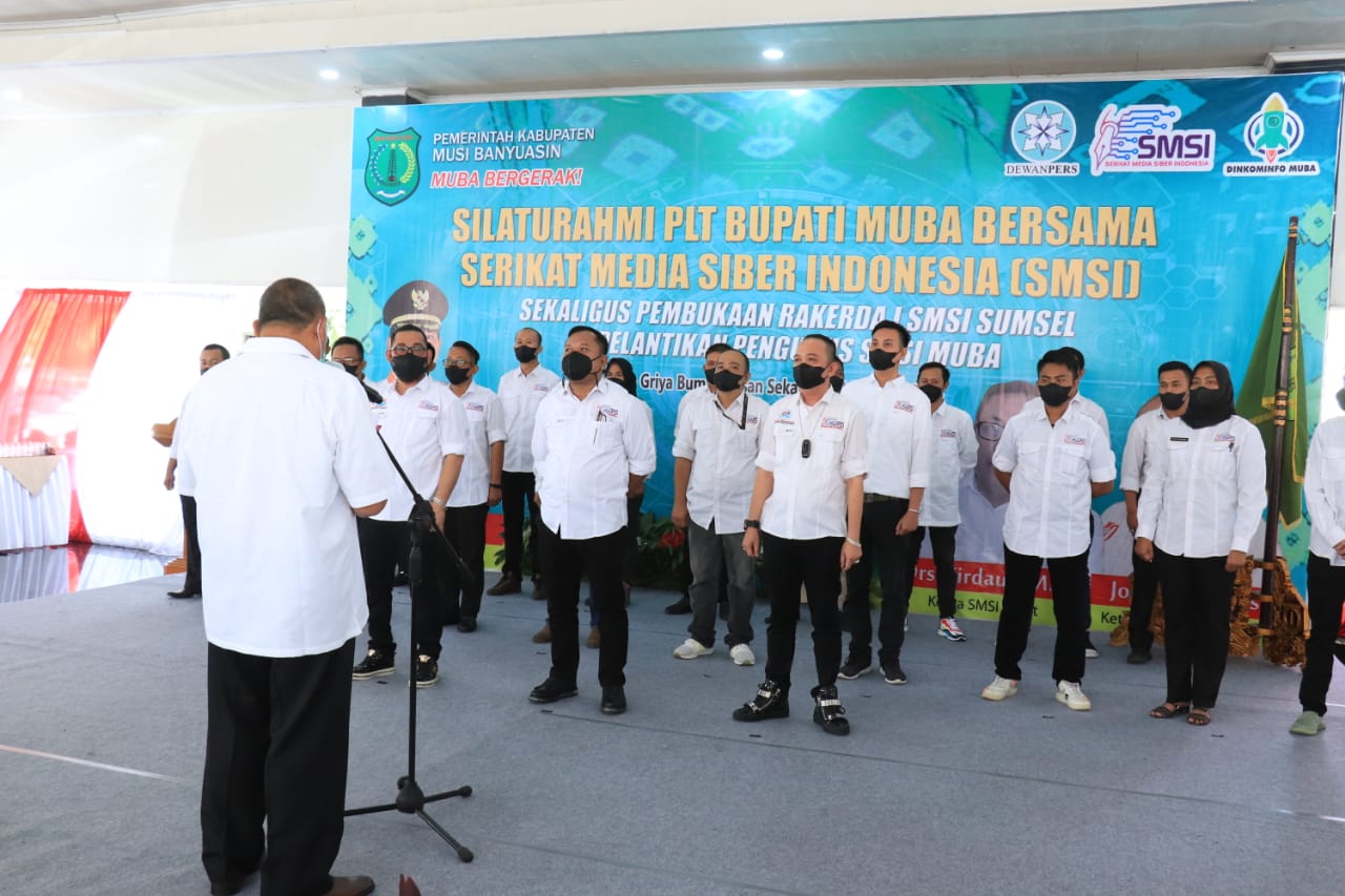 MUSI BANYUASIN-Pelaksanaan Rapat Kerja Daerah (Rakerda) Serikat Media Siber Indonesia (SMSI) ke I Sumsel dan Pelantikan Kepengurusan SMSI Musi Banyuasin (Muba) 2022-2025 berlangsung sukses. Pelantikan yang langsung disaksikan Ketua Umum (Ketum) Firdaus ini bertempat di Pendopoan Rumah Dinas Bupati Muba, Senin (24/1/2022).