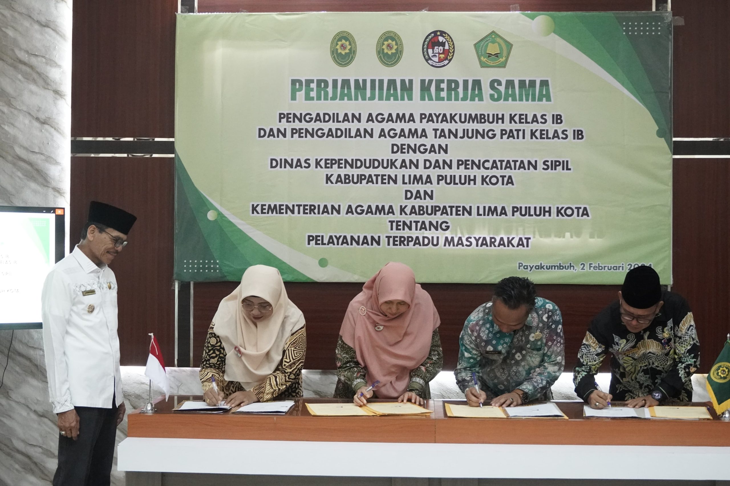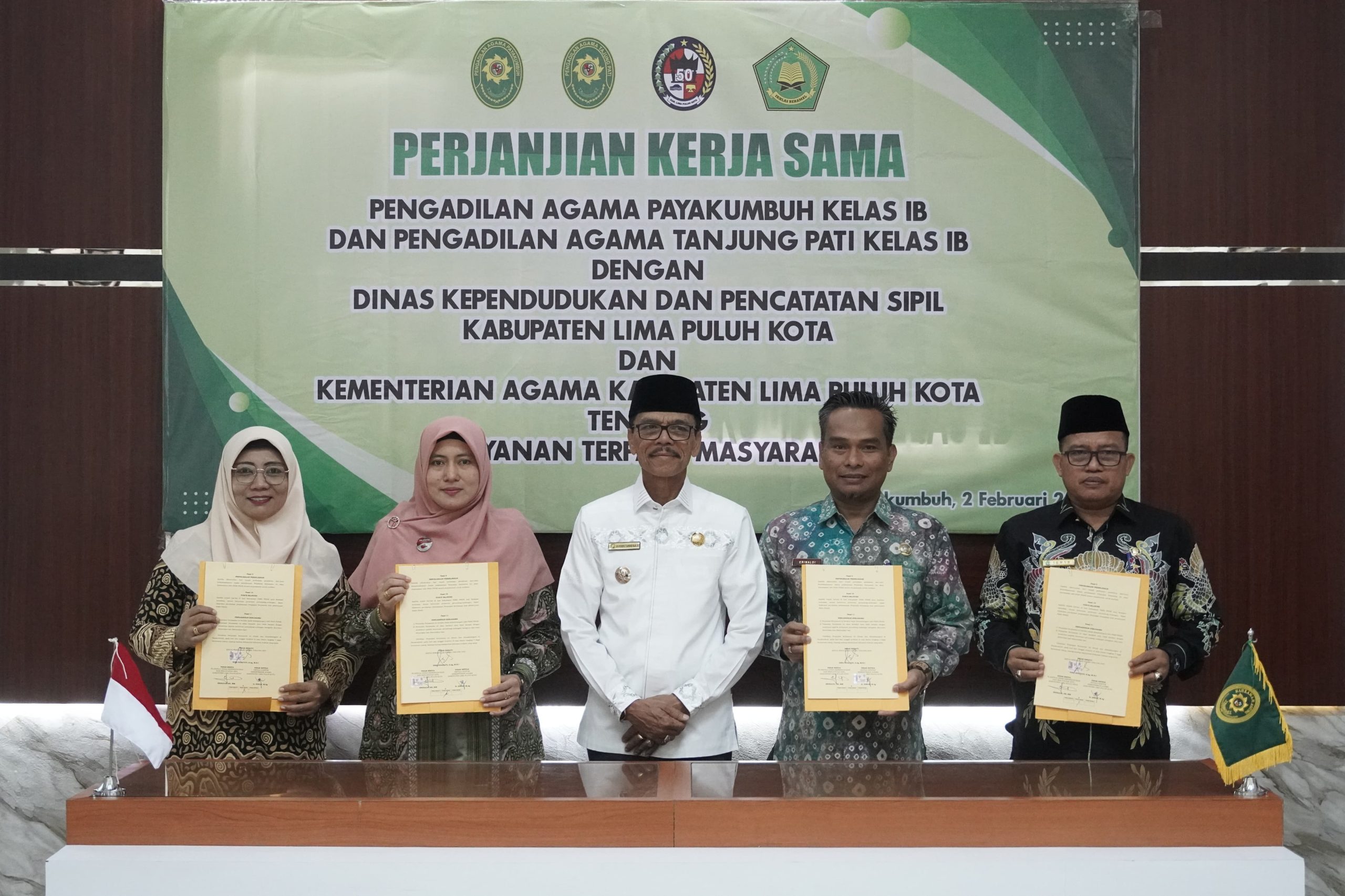 Limapuluh Kota, — Babak baru hubungan Pemerintah Kabupaten Lima Puluh Kota dengan Pengadilan Agama Tanjung Pati, Pengadilan Agama Payakumbuh dan Kemenag Limapuluh Kota bergulir. Hal itu ditandai dengan penandatangan Naskah Kerja Sama antara Dinas Kependudukan dan Catatan Sipil bersama ketiga instansi vertikal tersebut di Aula PA Payakumbuh, Jum’at, (02/02/2024).