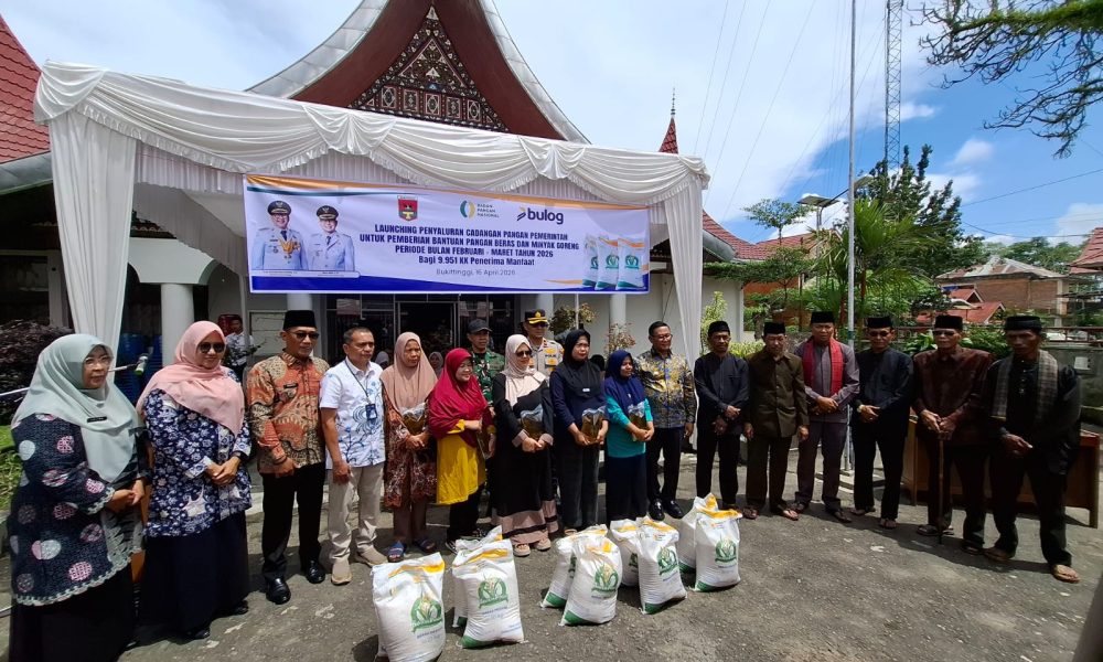Bukittinggi — Pemerintah Kota Bukittinggi melalui Dinas Pertanian dan Pangan bersama BULOG, salurkan bantuan Cadangan Pangan Pemerintah (CPP) untuk periode Februari dan Maret tahun 2026. Bantuan tersebut diserahkan secara simbolis oleh Wali Kota Bukittinggi, Ramlan Nurmatias, di Kantor Camat ABTB, Kamis, (16/4/2026).