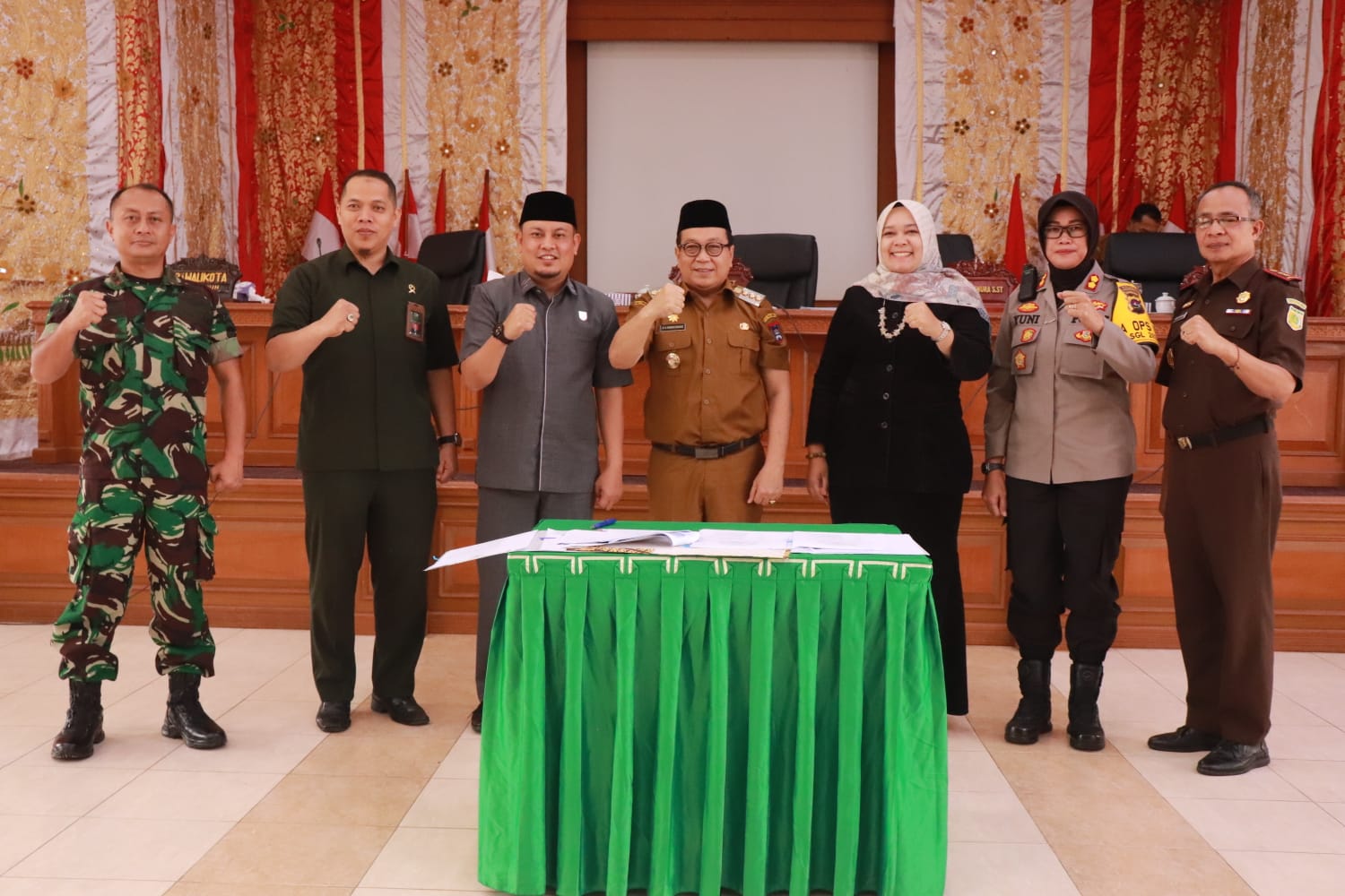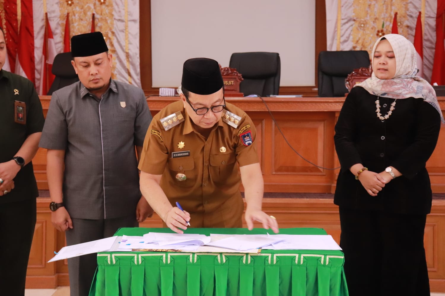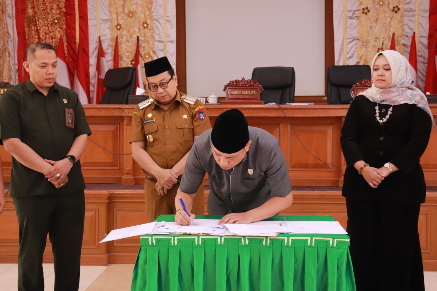 Payakumbuh – Bersama DPRD Kota Payakumbuh, Pj. Wali Kota Payakumbuh tanda tangani Berita Acara keputusan bersama penetapan Anggaran Pendapatan Belanja Daerah (APBD) Kota Payakumbuh tahun anggaran 2024.
