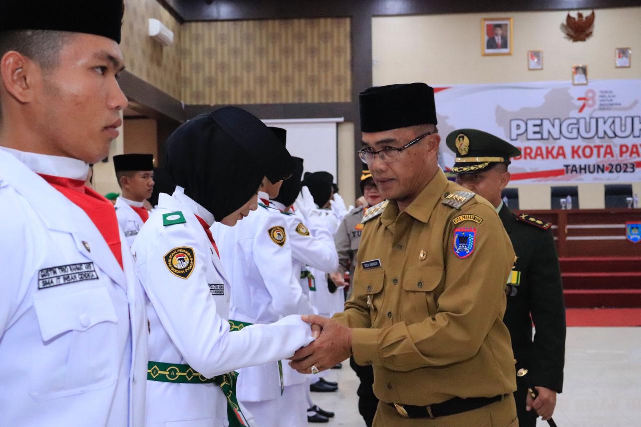 Payakumbuh—Menyonsong peringatan Hari kemerdekaan Republik Indonesia yang ke-78, Pj. Wako Rida Ananda hadiri Upacara Pengukuhan Pasukan Pengibar Bendera Pusaka (Paskibraka) Kota Payakumbuh Tahun 2023 di Aula Ngalau Lt. 3 Balai Kota Payakumbuh, Selasa (15/08/2023)