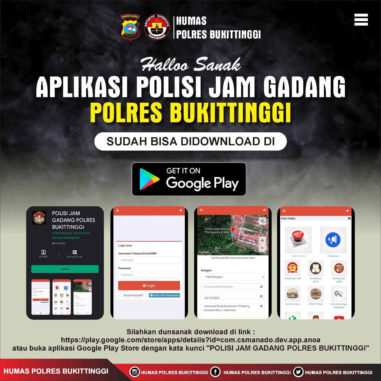 Kapolres Bukittinggi AKBP. Dody Prawiranegara, S.H., S.I.K., M.H. selasa (24/11) menjelaskan, Aplikasi diberi nama ‘Polisi Jam Gadang Polres Bukittinggi’ tersebut nanti dapat dipergunakan masyarakat dengan mendaftarkan diri terlebih dahulu dengan mengisi Form pendaftaran yang ada dalam aplikasi .