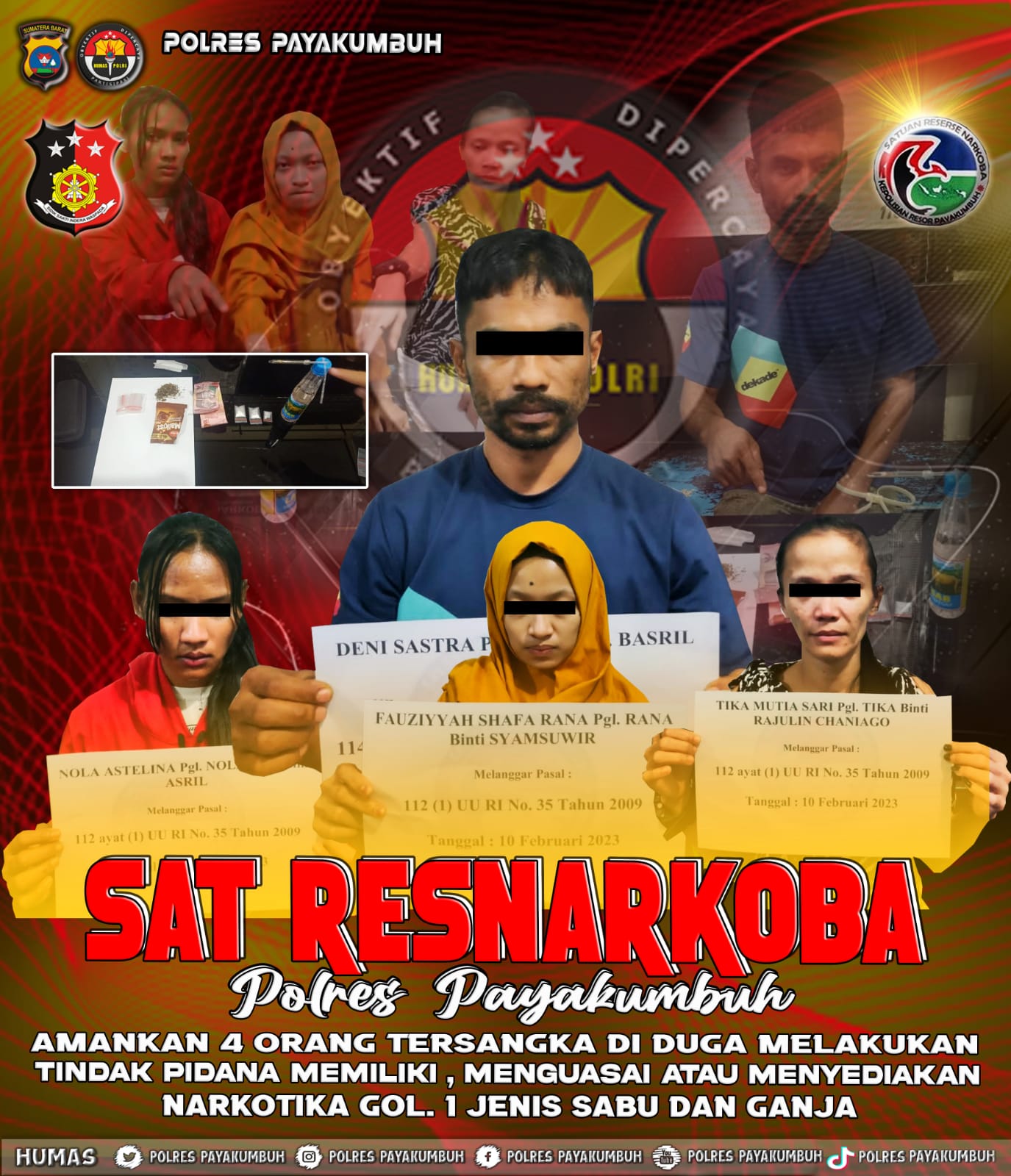 Pada hari Jum’at tanggal 10 Februari 2023 sekira pukul 20.30 wib telah di lakukan penangkapan terhadap 1 (satu) orang laki laki DS ( 40 ) dan 3 (tiga) orang perempuan yakni SR (22),TS ( 32 ) dan NA ( 22) yang diduga telah melakukan tindak pidana memiliki, menyimpan, dan menguasai narkotika jenis sabu dan ganja.