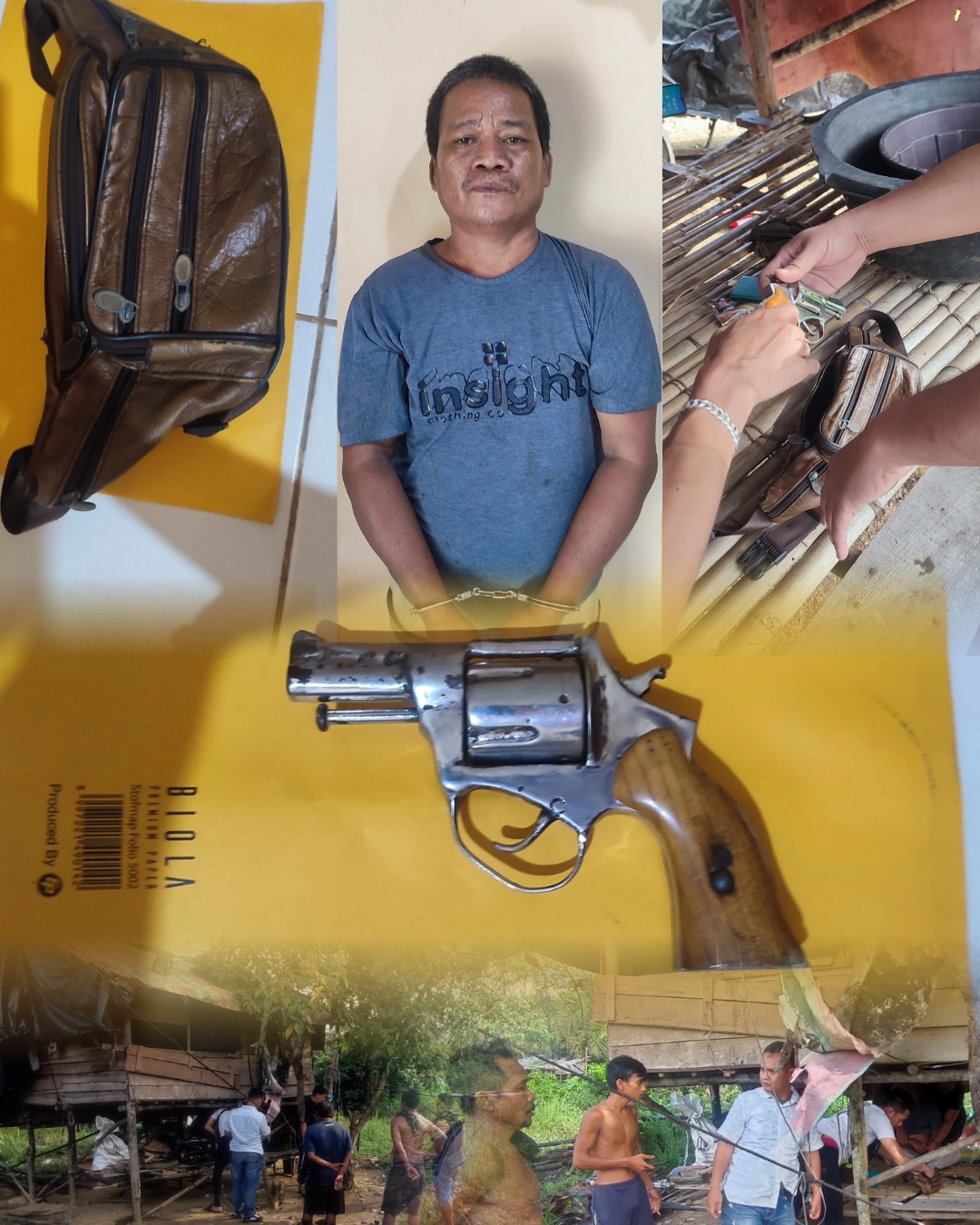 Dalam proses penggeledahan yang disaksikan warga setempat, petugas menemukan satu pucuk senjata api rakitan laras pendek jenis revolver beserta dua butir amunisi di dalam tas selempang warna coklat milik tersangka.