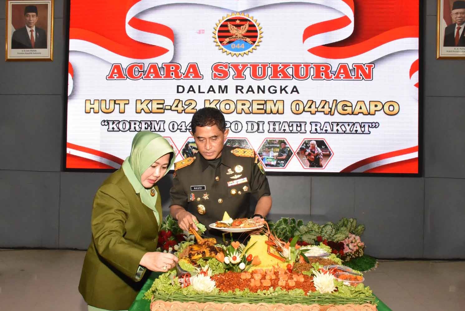 Acara Syukuran HUT ke-42 dipimpin langsung oleh Danrem 044/Gapo Brigjen TNI M. Naudi Nurdika, S.I.P., M.Si., M.Tr (Han) dan turut dihadiri Kasrem 044/Gapo Kolonel Inf Muhammad Tohir S.sos M.M., Kasiren Korem 044/Gapo, para Kasi Kasrem 044/Gapo, para Dandim Jajaran Korem 044/Gapo, Dan/Kabalak Jajaran Korem 044/Gapo, Ketua Persit KCK Koorcab Rem 044 PD II/Sriwijaya beserta Pengurus, para Perwira, Bintara, Tamtama dan PNS Korem 044/Gapo.