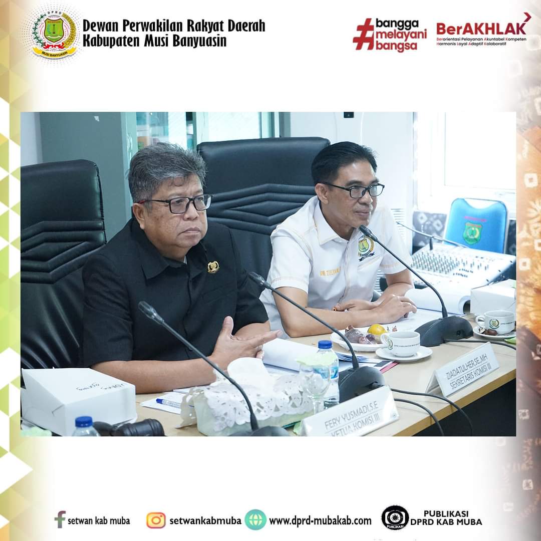 .Rapat di pimpin oleh Ketua Komisi III Feri Yusmadi, S.E, di hadiri oleh Wakil Ketua II DPRD Irwin Zulyani, S.H, Wakil Ketua Komisi III Paimin, S.E, Sekretaris Komisi III Ziadatulher, S.E.,M.H, Anggota Komisi III Nupri Soleh, S.Kom, Sodingun, S.H, Jupri Yansyah, Supriasihatin, Iwan Aldes, S. Sos.,M.Si, Rahman Halim, Damsih, S.H, Dinas Pekerjaan Umum dan Penataan Ruang Kabupaten Muba, Dinas Perumahan dan Kawasan Permukiman Kabupaten Muba, Bappeda Kabupaten Muba, Dinas Lingkungan Hidup Kabupaten Muba, Dinas Perhubungan Kabupaten Muba, dan Tim Ahli/Kelompok Pakar DPRD Kabupaten Muba.