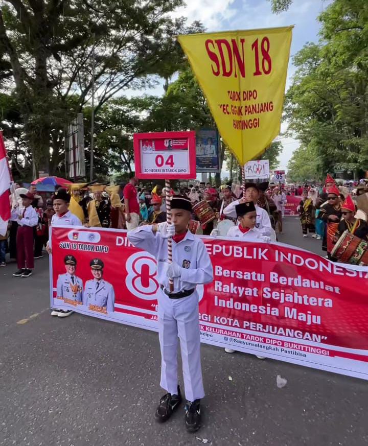 Tampak pelajar SDN 18 Tarok Dipo pesera pawai alegoris meriahkan HUT ke 80 Kemerdekaan RI di Kota Bukittinggi, Senin (18/8/2025). RIDWAN