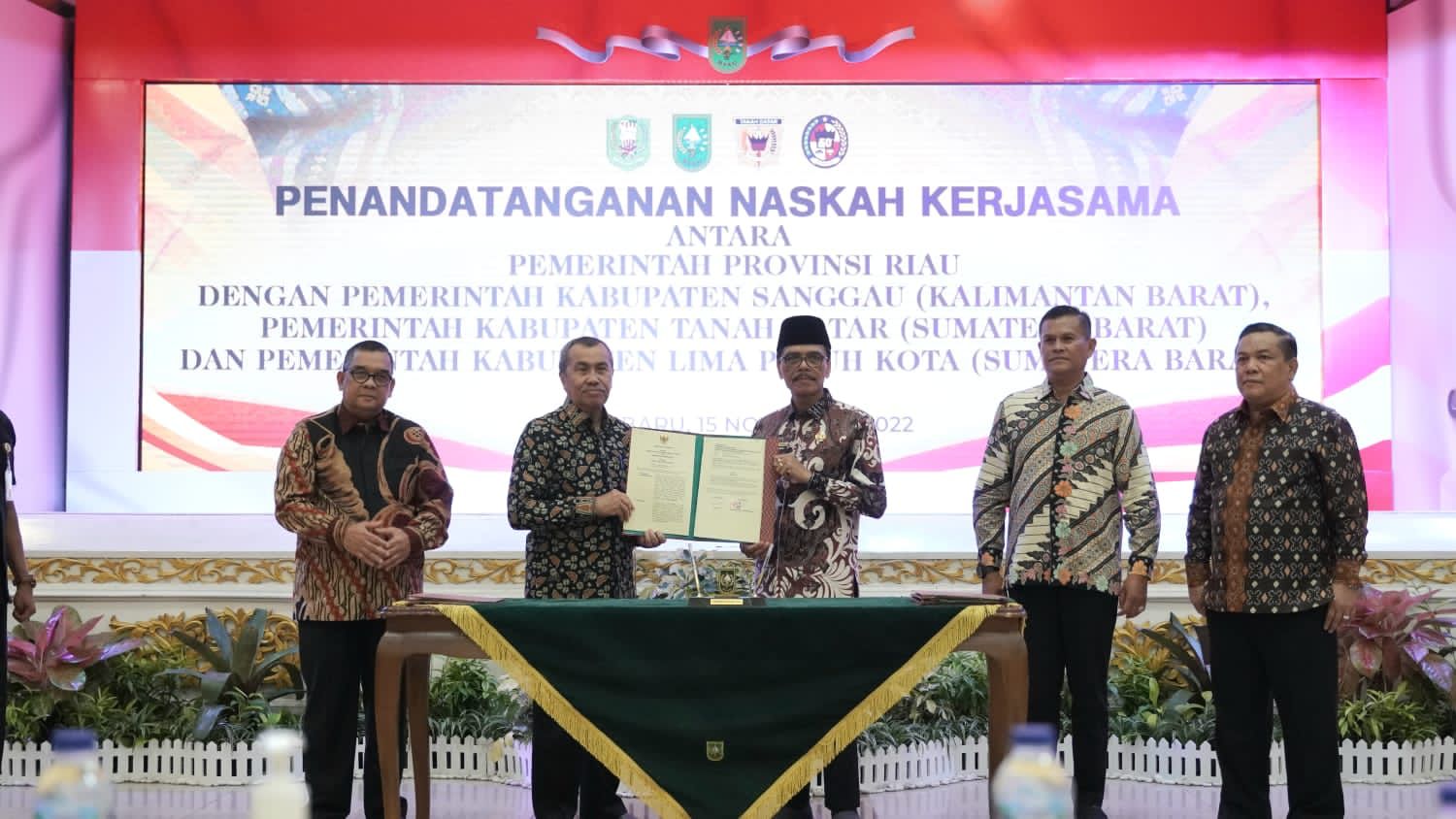 Kegiatan MoU berlangsung di Balai Serindit, Aula Gubernuran, Pekanbaru, pada Selasa (15/11/2022). Selain dengan Pemkab Limapuluh Kota, Pemkab Tanah Datar dan Pemkab Sanggau, Kalimantan Barat turut melaksanakan kegiatan serupa. Tampak Hadir Wakil Gubernur Riau Edy Natar Nasution, Sekretaris Daerah Riau Bustami, Ketua Komisi IV DPRD Riau Parisman Ihwan, Bupati Tanah Datar Eka Putra, Bupati Sanggau Paolus Hadi, Asisten I dan III Setdakab Limapuluh Kota Herman Azmar dan Ahmad Zuhdi Perama Putra, Kepala BKPSDM Adrian Wahyudi, Kepala Dinas Kominfo Eki Hari Purnama, serta sejumlah Kepala Bagian Setdakab Limapuluh Kota.