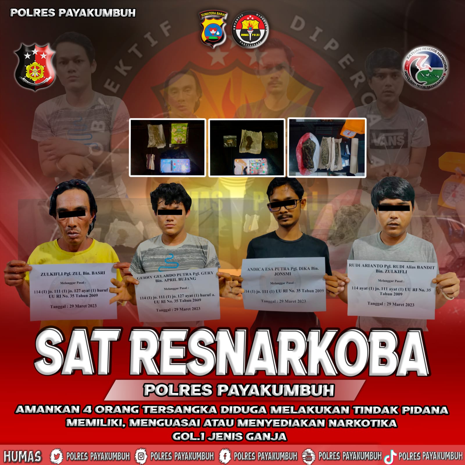 Payakumbuh,- Tim Phantom Squad Sat Narkoba Polres Payakumbuh menangkap empat orang pria yang di sangkakan telah melakukan tindakan penyalahgunaan narkotika jenis ganja, Rabu (29/03/2023) di lokasi yang berbeda.
