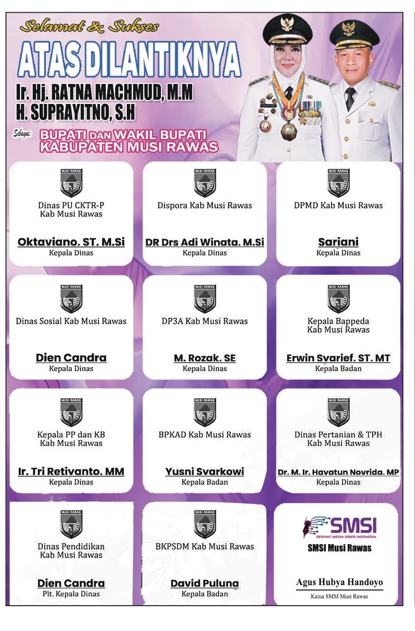 Selamat Atas Pelantikan Hj Ratna Machmud dan H Suprayitno Sebagai Bupati dan Wakil Bupati Musi Rawas Perioder 2025-2030