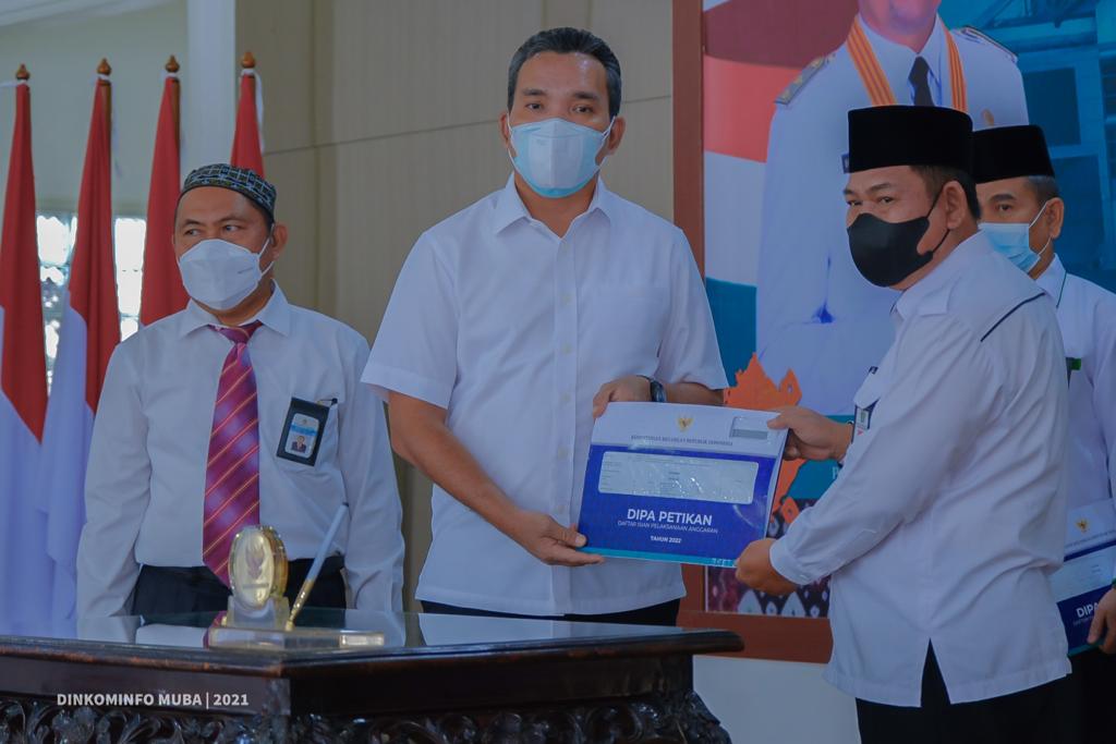 SEKAYU- Pemerintah Kabupaten Musi Banyuasin menggelar acara penyerahan Daftar Isian Pelaksanaan Anggaran (DIPA) petikan Anggaran Pendapatan Belanja Negara (APBN) dan penyerahan Daftar Alokasi Transfer Ke Daerah dan Dana Desa (TKDD) tahun 2022, di Guest House Griya Bumi Serasan Sekate, Senin (13/12/2021).