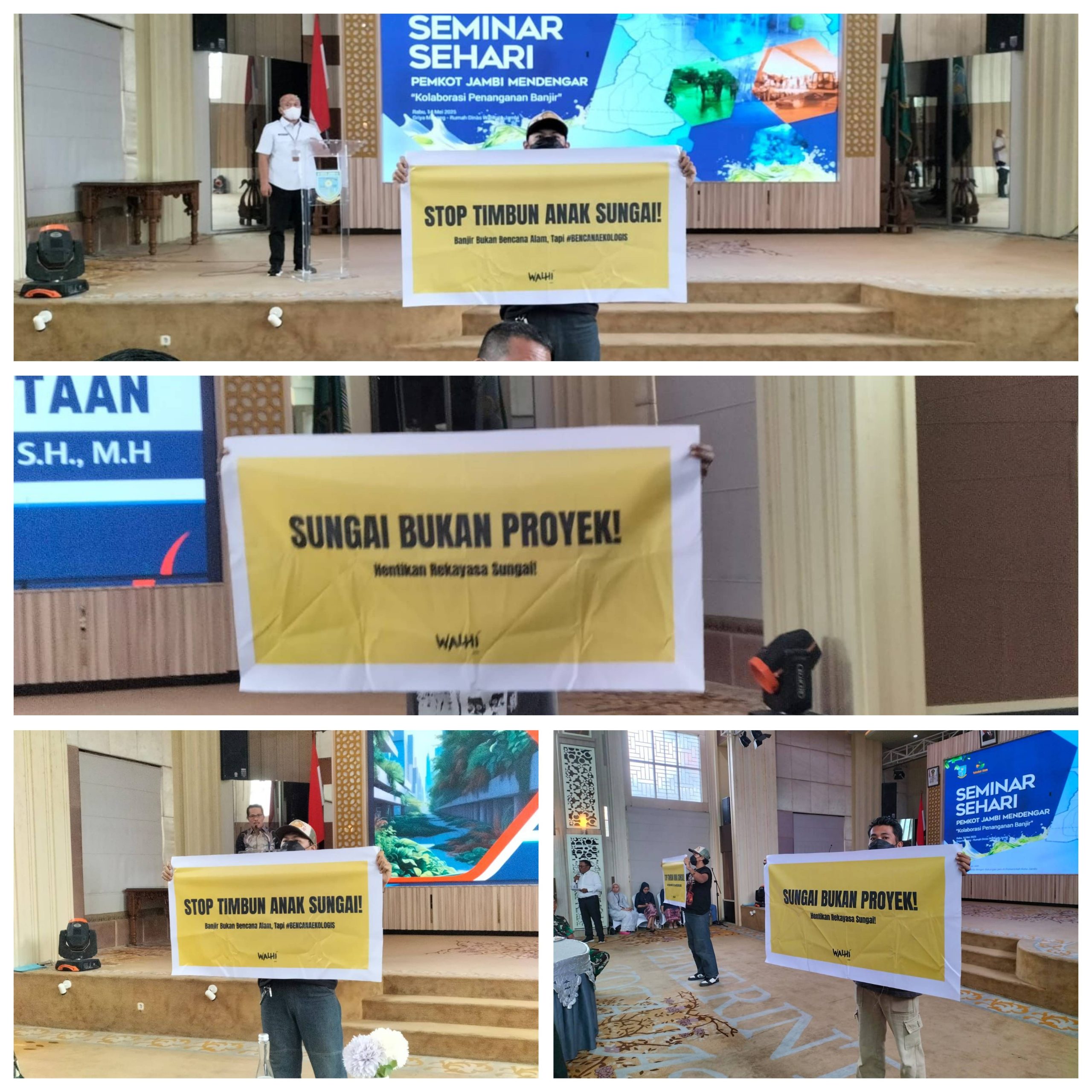 Kota Jambi – Wahana Lingkungan Hidup Indonesia (Walhi) Jambi menggelar aksi protes serta meminta Pemerintah Daerah Jambi tegas menghukum perusahaan yang merusak lingkungan dan menimbulkan kerugian ekologis. Aksi ini disampaikan dengan membentang poster dalam forum Seminar Sehari “Pemkot Jambi Mendengar” yang berlangsung di aula Rumah Dinas Walikota Jambi, Rabu (14 Mei 2025).