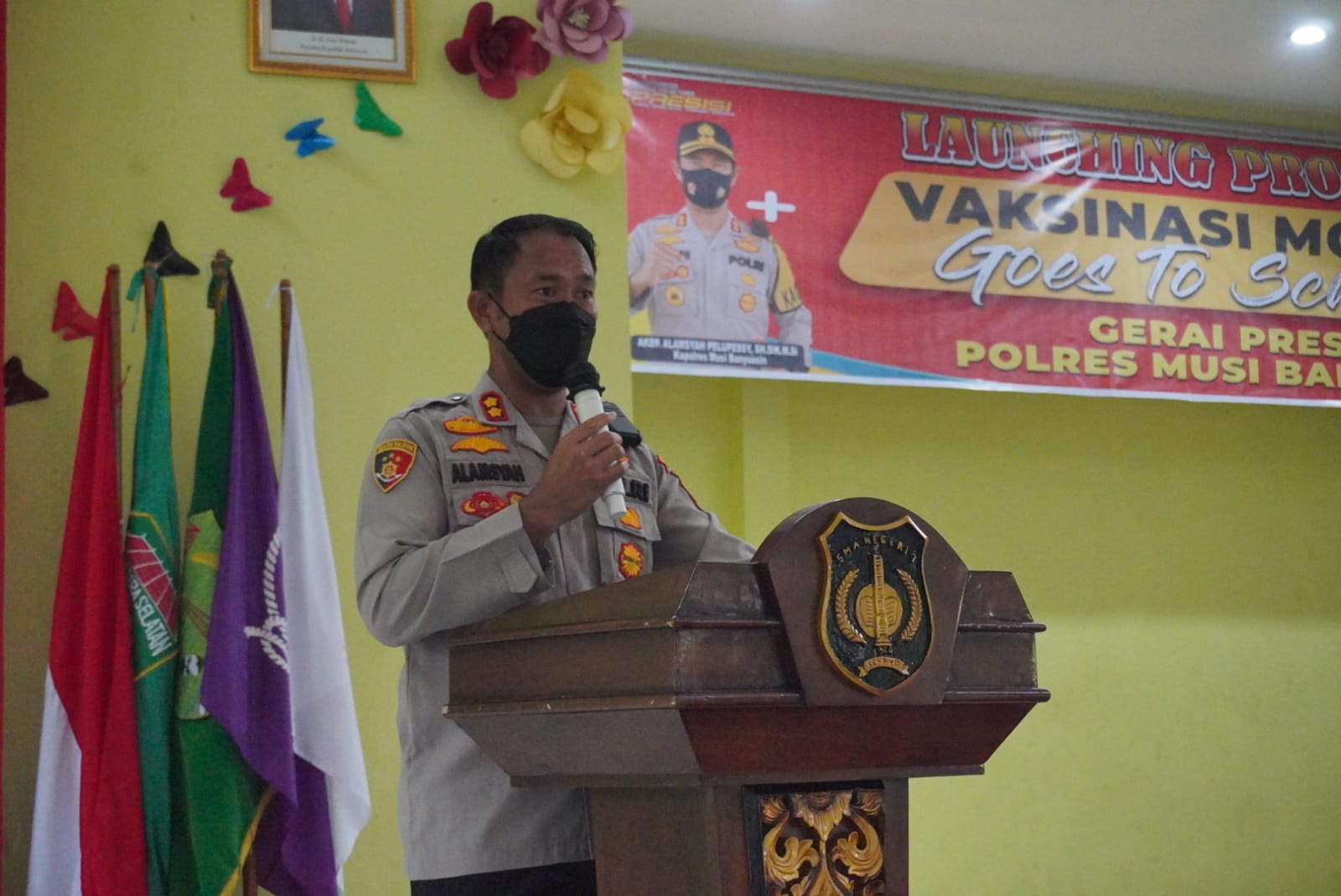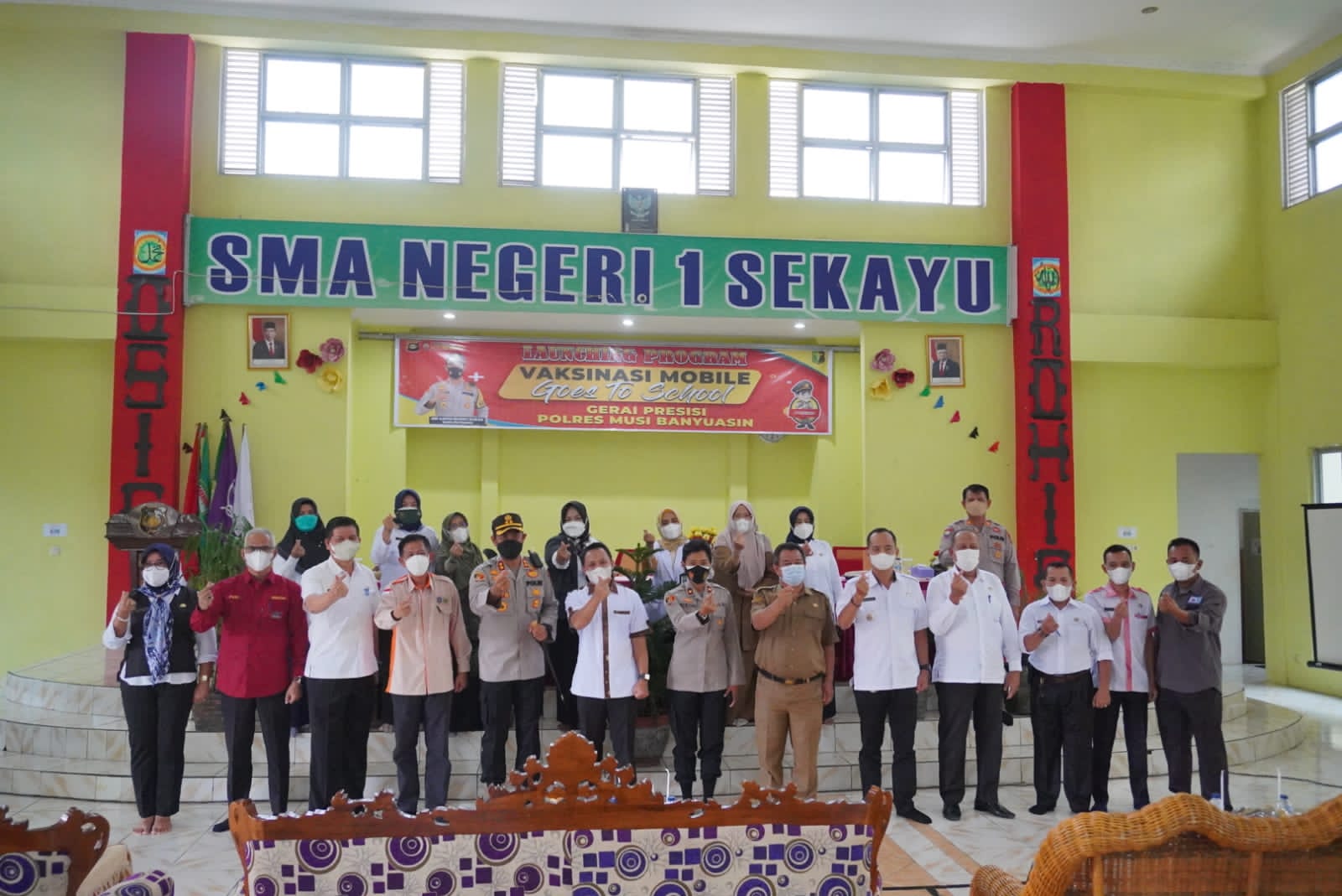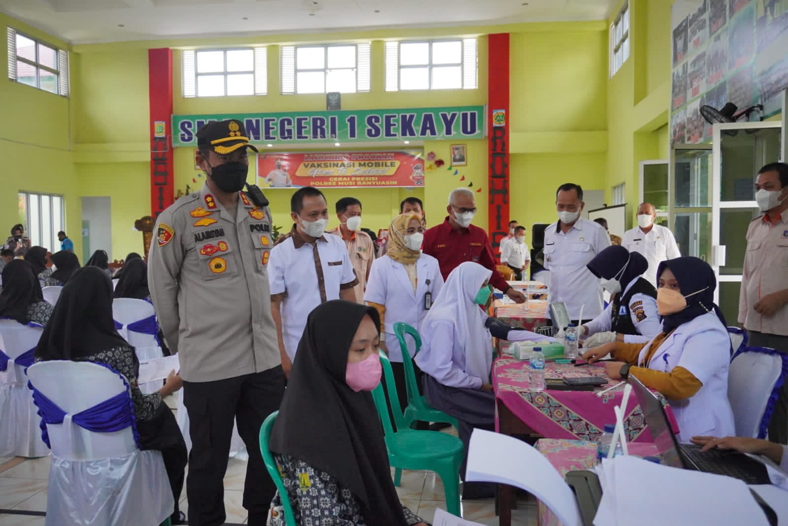 SEKAYU, MUBA– Sebanyak 450 Siswa- Siswi SMAN 1 Sekayu mengikuti Program Vaksinasi Mobile Goes To School Gerai Presisi Yang diadakan oleh Polres Musi Banyuasin bertempat di Aula SMAN 1 Sekayu, Jln Merdeka No.097 kelurahan Serasan Jaya, kecamatan Sekayu kabupaten Muba, Kamis ( 02/09/2021).