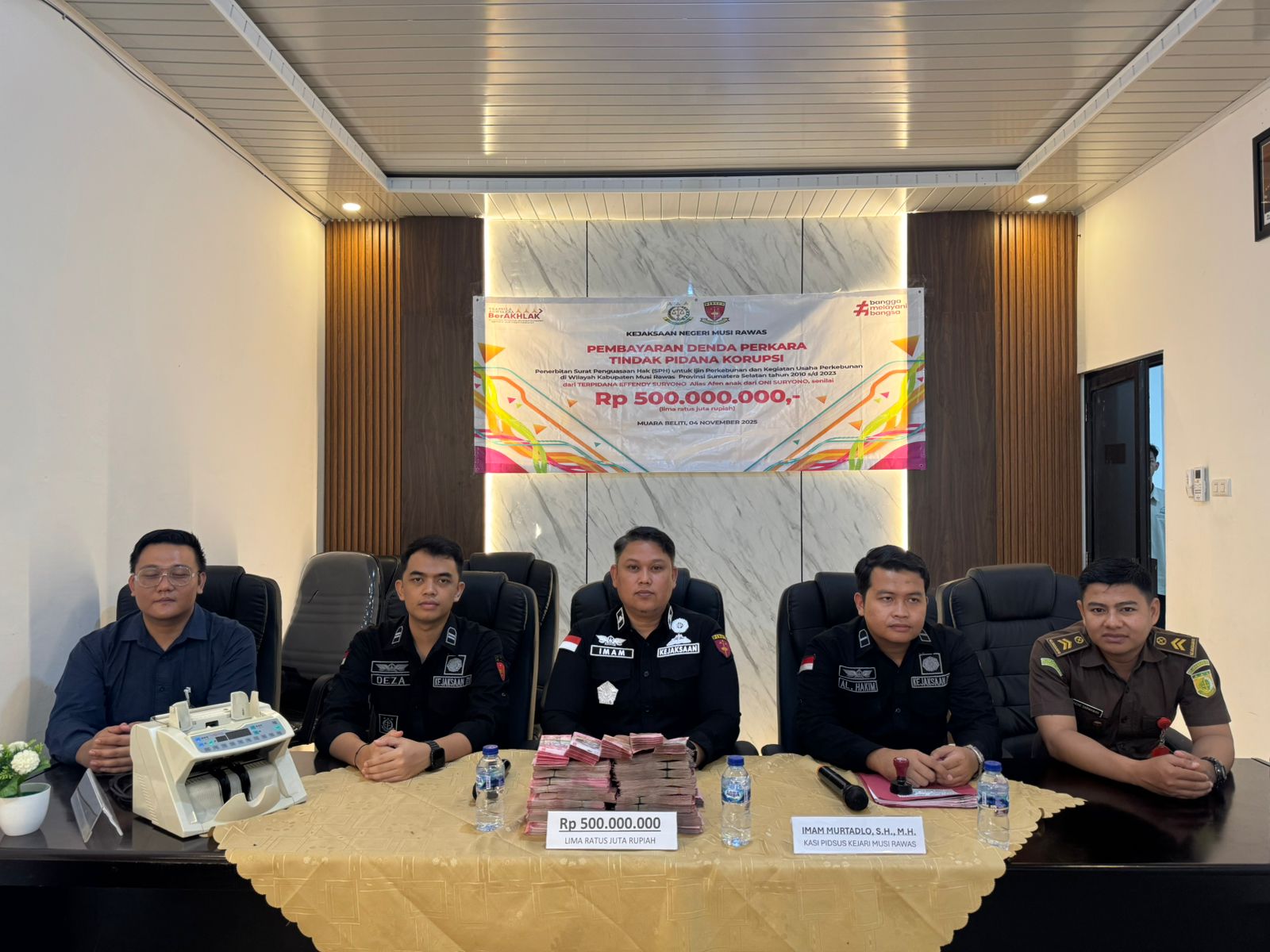 Musi Rawas – Terpidana kasus korupsi penerbitan Surat Penguasaan Hak (SPH) untuk izin dan kegiatan usaha perkebunan di Kabupaten Musi Rawas, Sumatera Selatan, Effendy Suryono alias Afen membayar uang denda sebesar Rp500 juta. Pembayaran dilakukan langsung di Kantor Kejaksaan Negeri (Kejari) Musi Rawas, Selasa (4/11/2025) pagi.