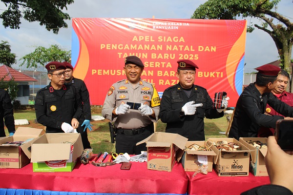 BANYUASIN.Kepala Divisi Pemasyarakatan Kanwil Kemenkumham Sumatera Selatan Mulyadi memimpin Apel Siaga Pengamanan Natal 2024 dan Tahun Baru 2025 dan pemusnahan barang bukti hasil razia bagi Unit Pelaksana Teknis Pemasyarakatan Sumatera Selatan pada, Jumat (20/12/2024).