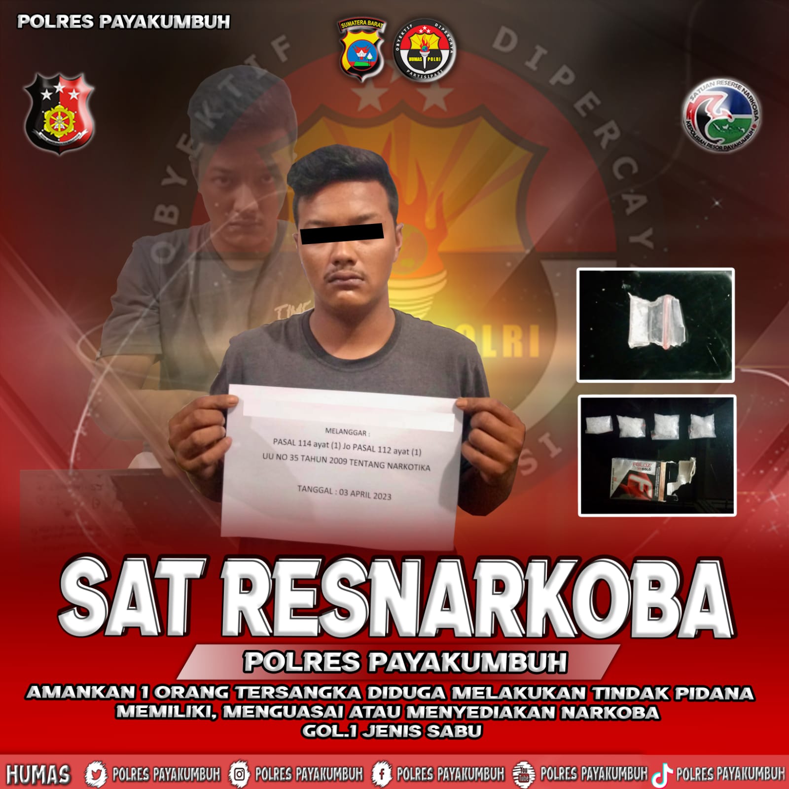 Payakumbuh,- Kepolisian Resor (Polres) Payakumbuh melalui Satuan Narkoba menangkap satu orang pemuda yang di duga sedang melaksanakan transaksi narkotika jenis sabu di sebuah rumah yang beralamat di Kelurahan Koto Kaciak Kubu Tapak Rajo Kecamatan Payakumbuh Utara, Senin (03/04/2023)
