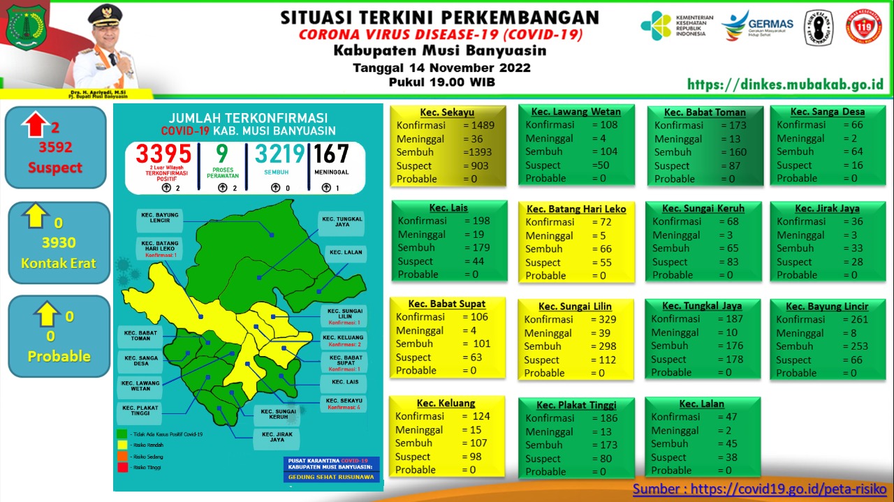 “Ada penambahan 2 kasus positif dan 1 meninggal dunia per 14 November 2022,” ungkap Jubir Gugus Tugas Penanganan COVID-19 Muba, dr Povi Pada Indarta SP P.