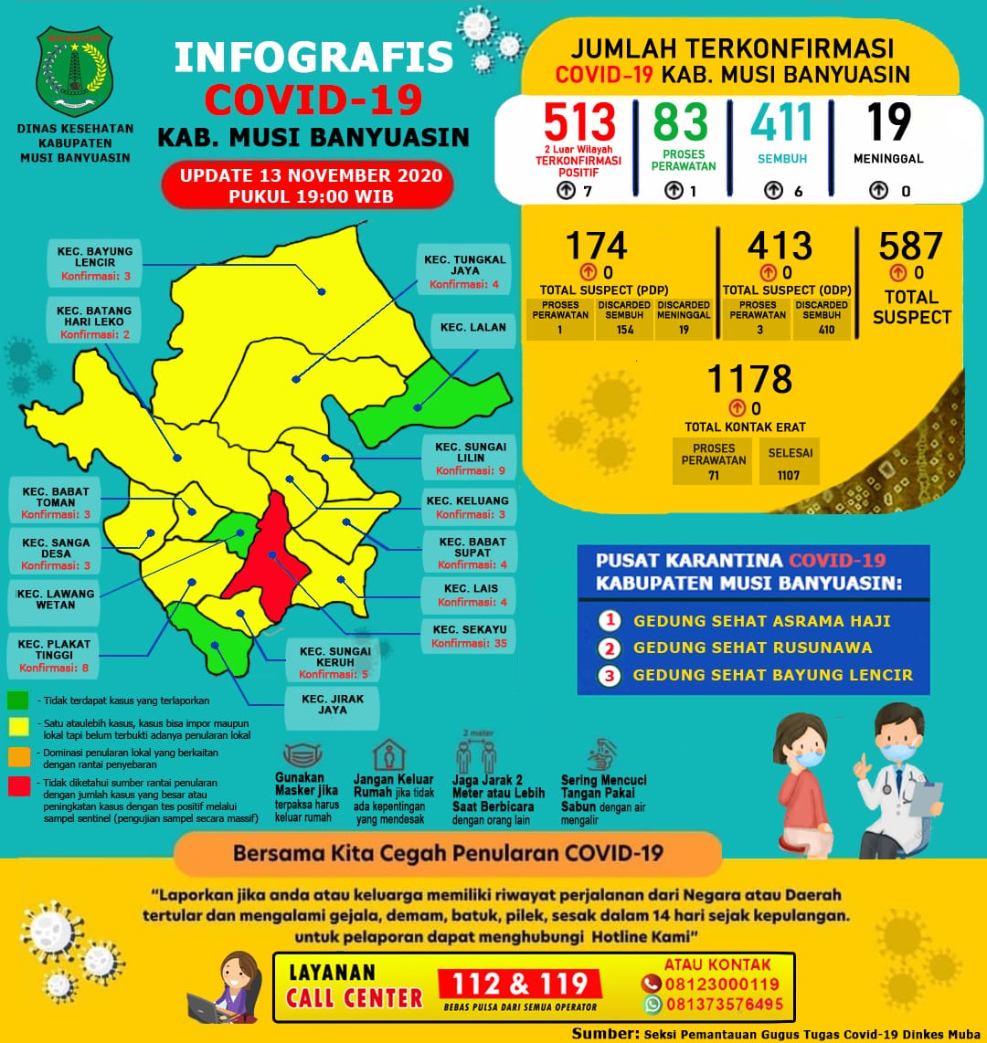 Ia menambahkan, hingga 13 November 2020 ada sebanyak 513 kasus terkonfirmasi di Muba. “Diantaranya 411 kasus sembuh, 19 meninggal dunia, dan 83 masih dirawat,” terangnya.