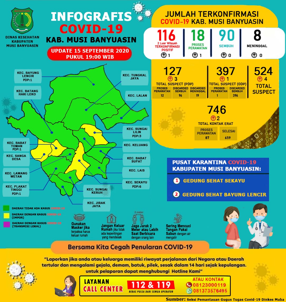 Sementara itu, berdasarkan data update Gugus Tugas Penanganan COVID-19 Muba 15 September 2020 tercatat ada sebanyak 397 ODP 1 selesai pemantauan masih dipantau 396 orang, 746 kontak erat 659 kontak selesai pemantauan 87 kontak erat yang masih dipantau, 127 PDP 12 proses pengawasan 96 selesai pengawasan.(Ril/Ray)