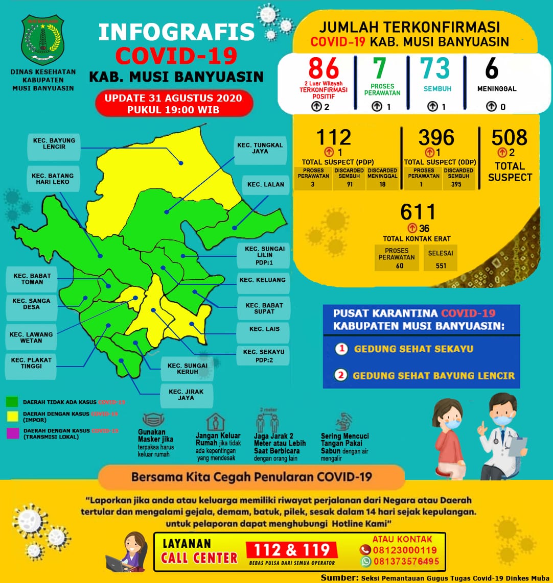 Lalu, ada penambahan 2 kasus baru yakni kasus 85 dari Kelurahan Kayuara dirawat di RSUD Sekayu dan kasus 86 dari Bayung Lencir dirawat di RSUD Bayung Lencir.