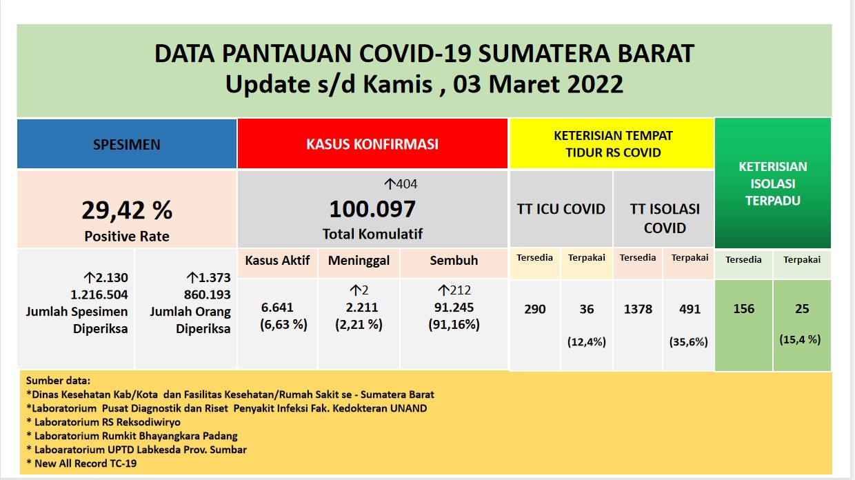 Update Covid-19 Sumbar, Kamis 3 Maret 2022 terkonfirmasi positif sebanyak 404 orang,