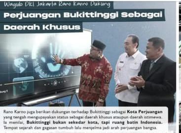Rano Karno juga berikan dukungan terhadap Bukittinggi sebagai Kota Perjuangan yang tengah mengupayakan status sebagai daerah khusus ataupun daerah istimewa. la menilai, Bukittinggi bukan sekedar kota, tapi ruang batin Indonesia. Tempat sejarah dan gagasan tumbuh lalu menjelma jadi arah perjuangan bangsa.