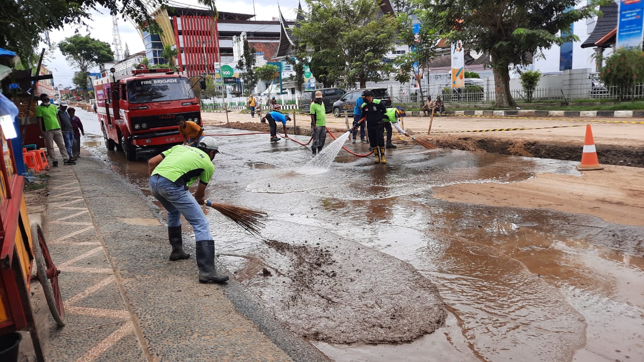 Setidaknya 50 orang personil Dinas PUPR dengan diperkuat 2 unit armada mobil Pemadam Kebakaran, , Skid Loader, dan juga 2 unit Mobil Penyemprotan Taman Dinas Lingkungan Hidup, berada di lokasi untuk melakukan pembersihan.