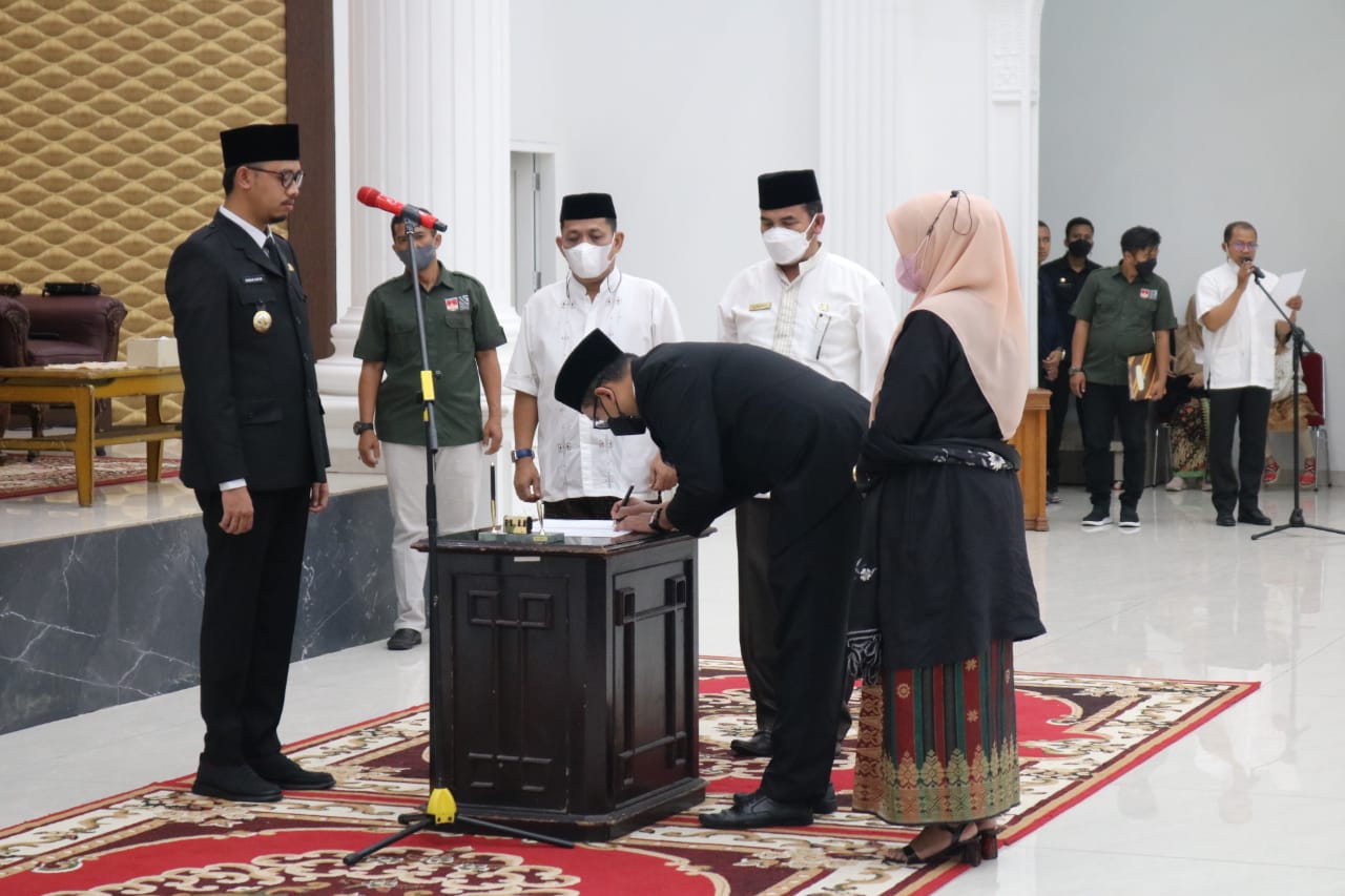 Wako Bukittinggi Erman Safar Melantikan dan Pengambilan Sumpah/Janji Jabatan dalam rangka Penyetaraan Jabatan Administrasi ke dalam Jabatan Fungsional di Lingkungan Pemerintah Kota Bukittinggi Jumat 31/12/2021.