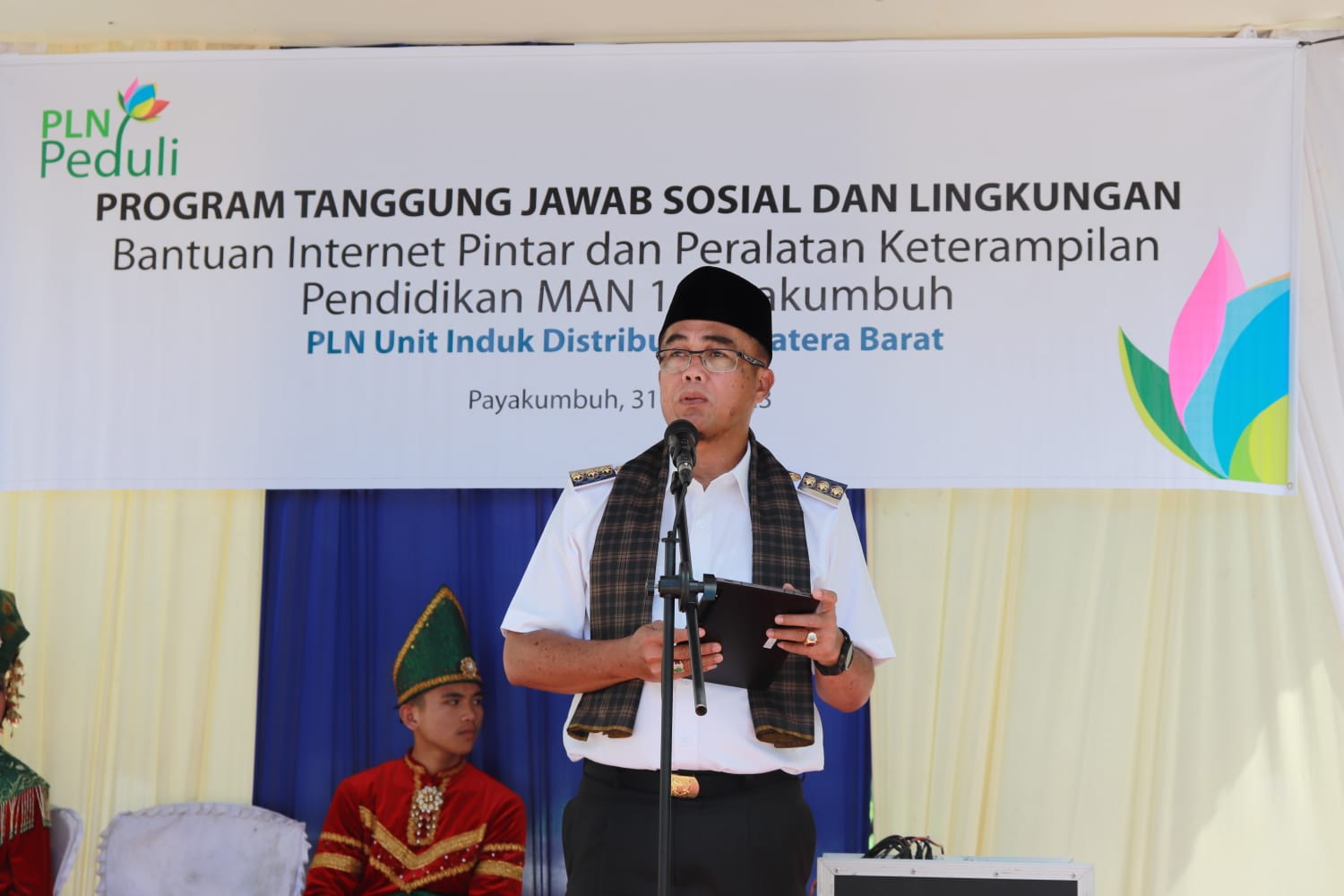Payakumbuh — Penjabat Wali Kota Payakumbuh Rida Ananda menyampaikan apresiasi kepada Perusahaan Listrik Negara (PLN) yang telah menyerahkan bantuan Tanggung Jawab Sosial dan Lingkungan (TJSL) untuk perpustakaan digital dan alat labor keterampilan MAN 1 Payakumbuh.