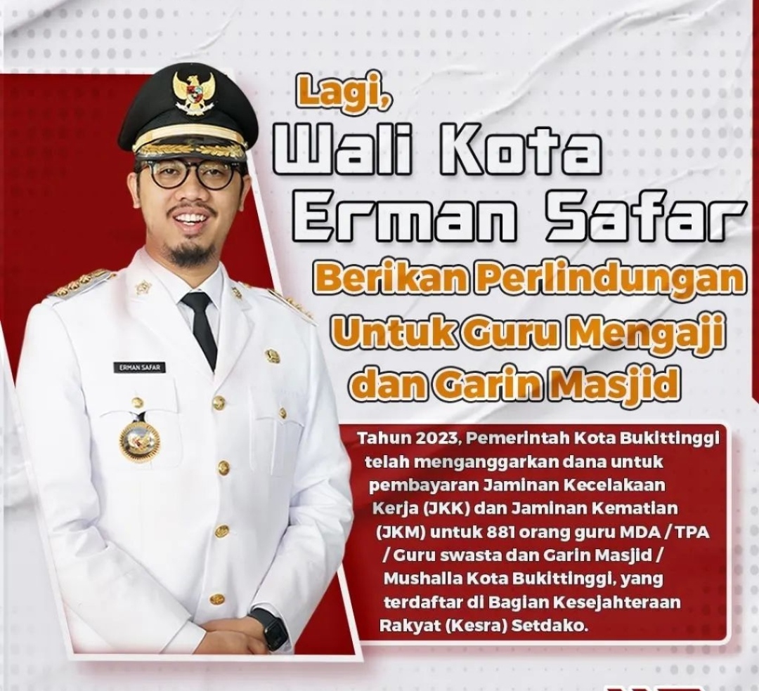 Tahun 2023 ini, Pemerintah Kota Bukittinggi telah menganggarkan dana untuk pembayaran Jaminan Kecelakaan Kerja (JKK) dan Jaminan Kematian (JKM) untuk 881 orang guru MDA/ TPA/Guru swasta dan Garin Masjid/Mushalla Kota Bukittinggi, yang terdaftar di