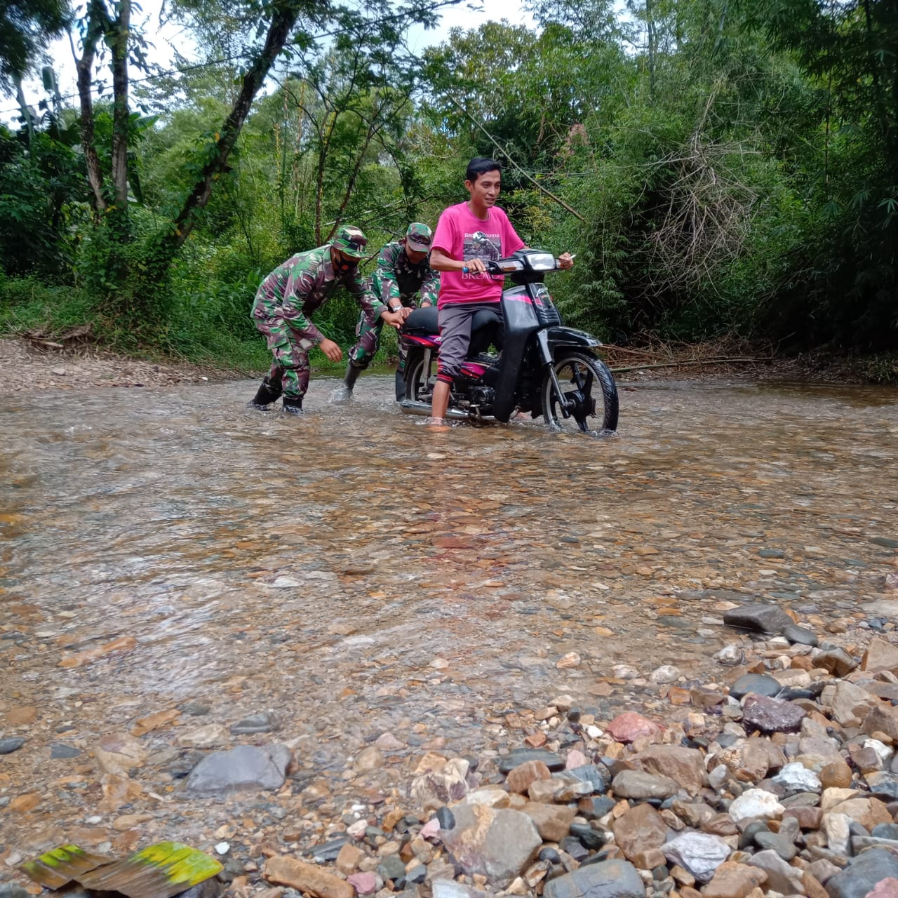 Ini bisa dilihat dari yang dilakukan Personel Satgas TMMD Ke 111 Kodim 0306/50 Kota yang sedang membantu beberapa orang warga masyarakat yang didalamnya ada beberapa anak anak dalam menyeberangi anak sungai. Selasa (13/7/2021).